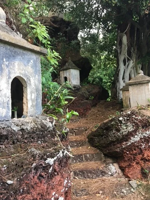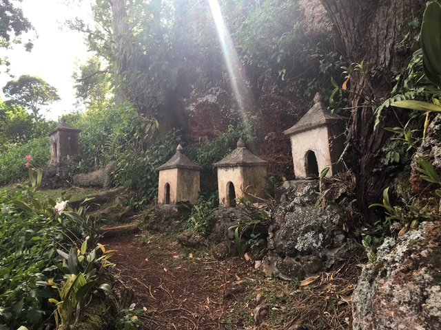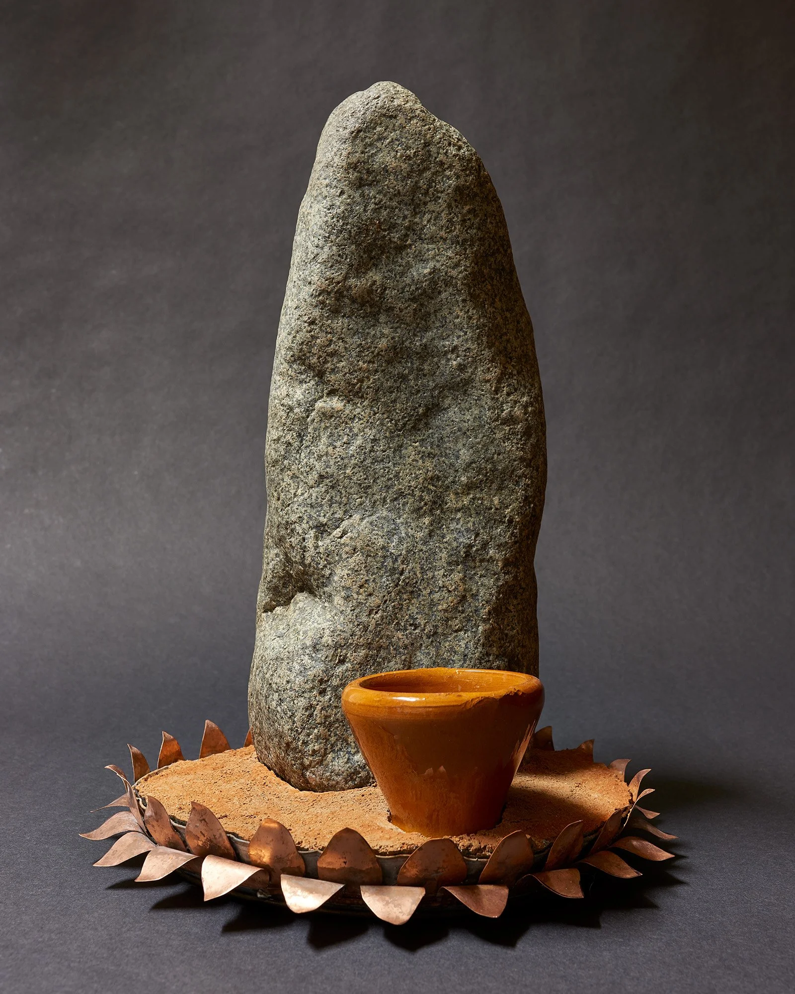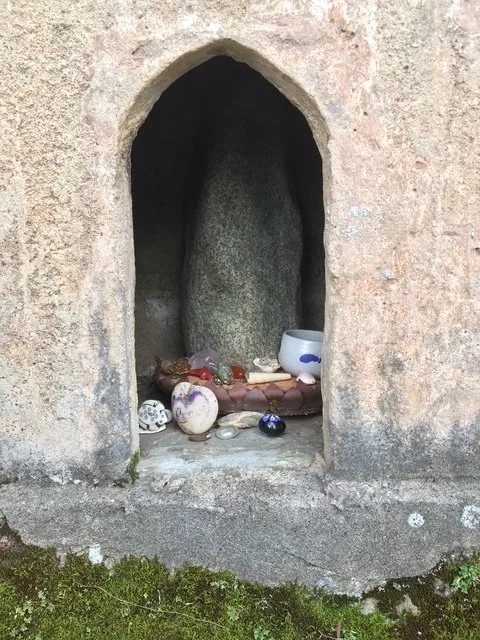 On a visit to Kauai in 1989, a good friend of mine took me to see an old, ruined Buddhist temple with smallcreate a new figure for Shrine #18, symbolizing Yakushi Nyorai, βThe Healer,β and I pondered how to represent the spirit of the deity. Years before, I had pulled a granite stone from a California river. For years aSerward, it held some kind of presence despite my neglect and incomprehension. For this project, the unaltered stone became my way to convey a feeling that sDll endures from my first glimpse of that temple in the forest.